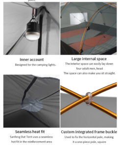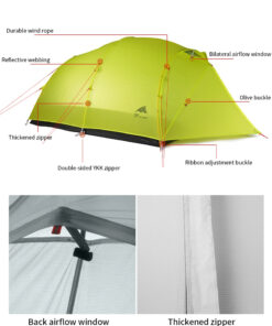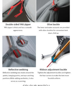 - Tent flysheet material: 15D silicone coated nylon (PU5000MM waterproof index).