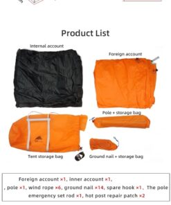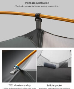 - Inner tent material: 40D silicone coated nylon floor (5000MM waterproof index) + 210T PU waterproof polyester + high density mosquito mesh.