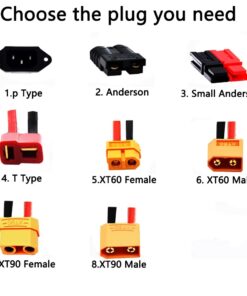 - Note: The correct wall plug/adaptor for your battery charger will be automatically included based on the country of delivery. Default battery discharge connector type is (+ – wires), contact us with your order for a customized connector from the following selection: P; Anderson; small Anderson; T; XT60 Female; XT60 Male; XT90 Female; XT90 Male.
