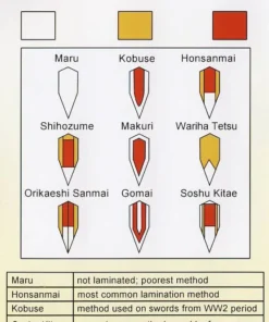 - Blade material: 1095, 1060 carbon steel + folded steel Katana blade – Honsanmai laminate configuration.