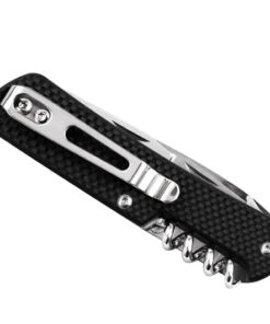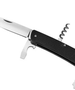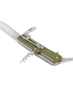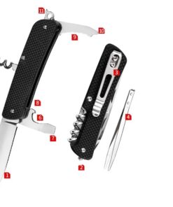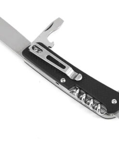 - Incorporated tools: Primary knife; small flat-head screwdriver; large flat-head screwdriver; bottle opener; cork screw; tweezers; serrated rope cutter; wire stripper; pommel glass breaker; keyring hole.