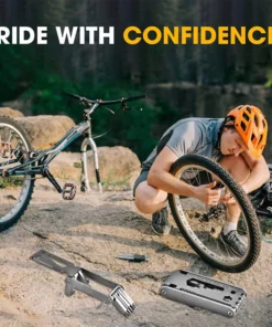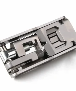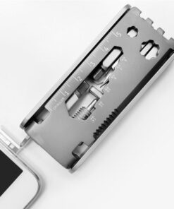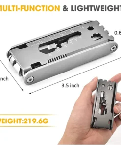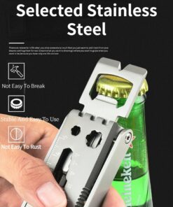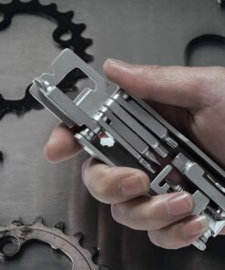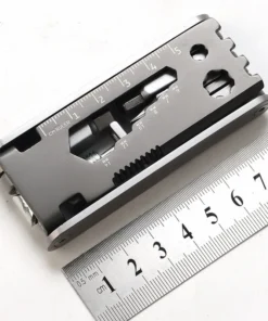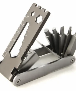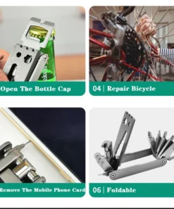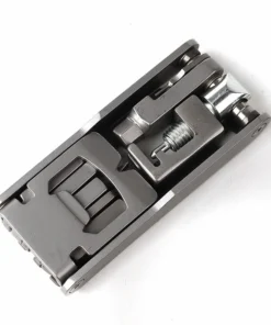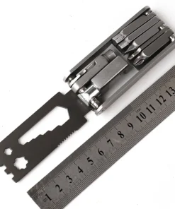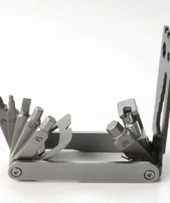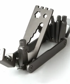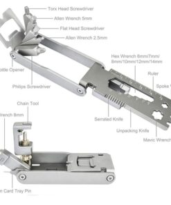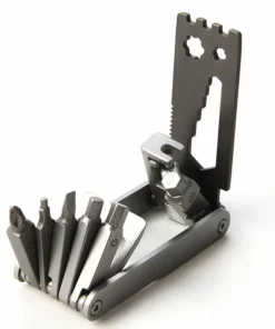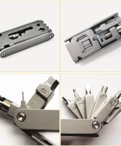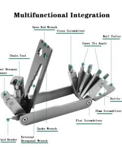 Incorporated into the multifunction tool are the following: 5x screwdrivers; nail puller; bottle opener; spoke wrench; chain tool; inner hex bit; variable hex wrench; sim card pin; spoke wrench; measurement ruler; partially serrated knife blade.