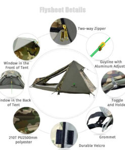- Tent flysheet material: 210T polyester – tape seam sealed (PU5000MM waterproof index).