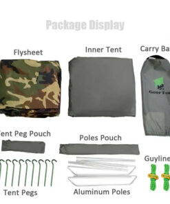 - Included: 1x inner tent; 1x fly sheet; 12x tent stakes; 2x aluminum poles; 2x tent ropes; 1x tent carry bag.