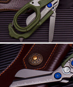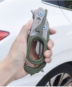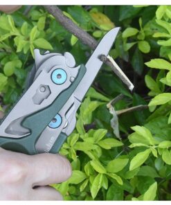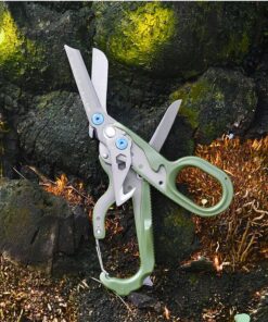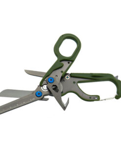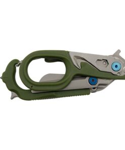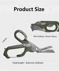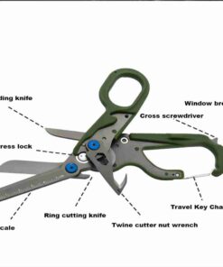 - Incorporated tools: Knife blade; scissors; ring cutting knife; rope cutter + variable wrench combo; flat-head screwdriver; glass breaker pommel; measurement ruler; carabiner clip.