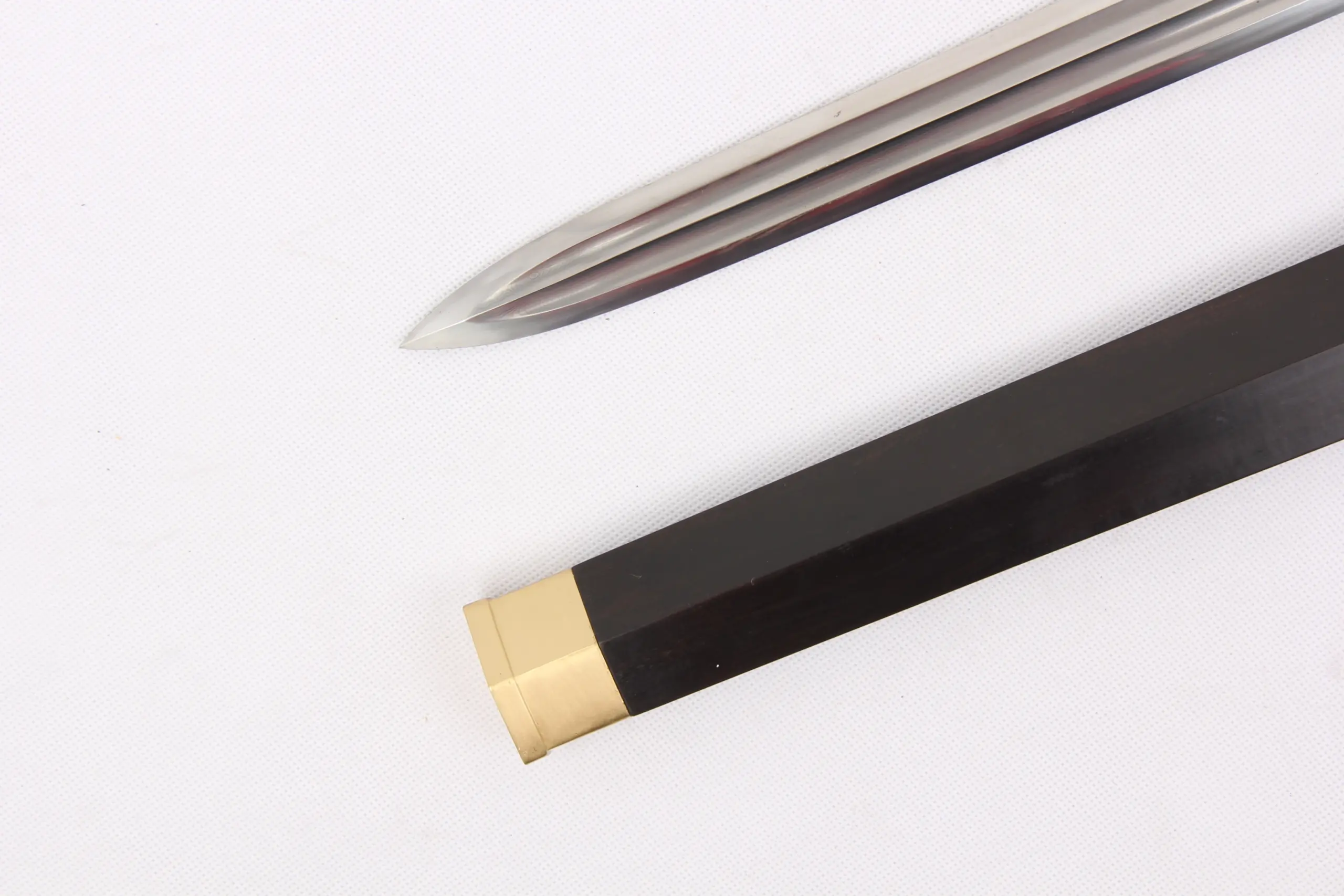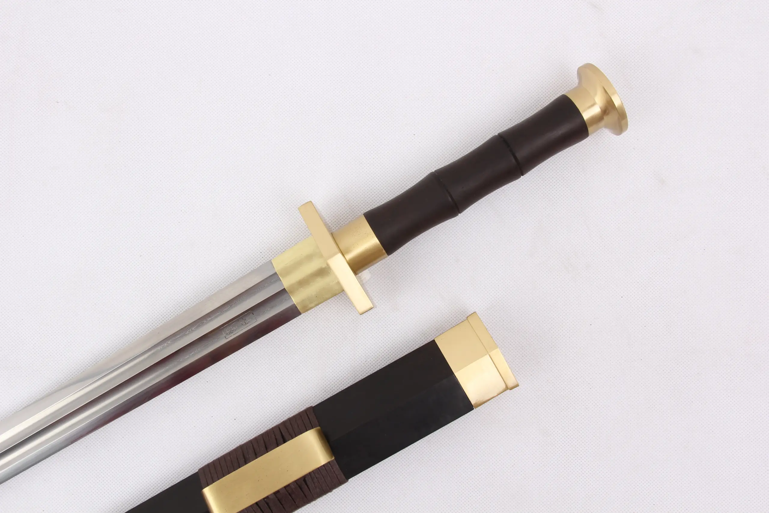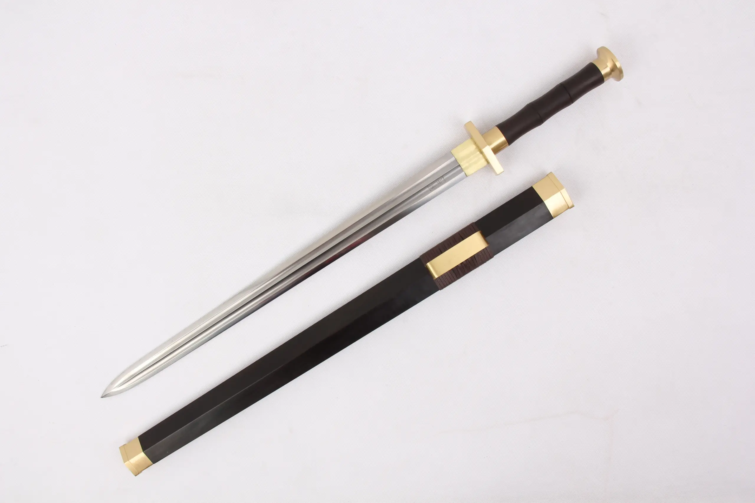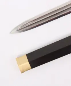 Completed with a premium Ebony hardwood scabbard, solid brass sword-fittings, and a matching Ebony hardwood handle, forming a traditional, simple and effective hand-grip.