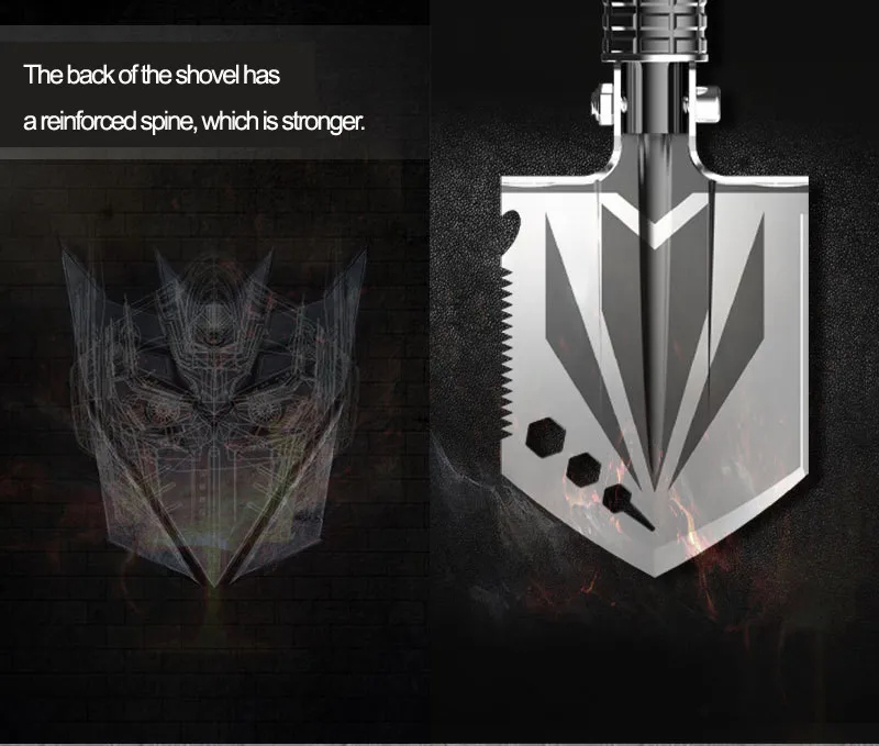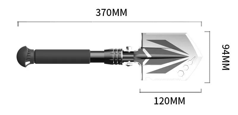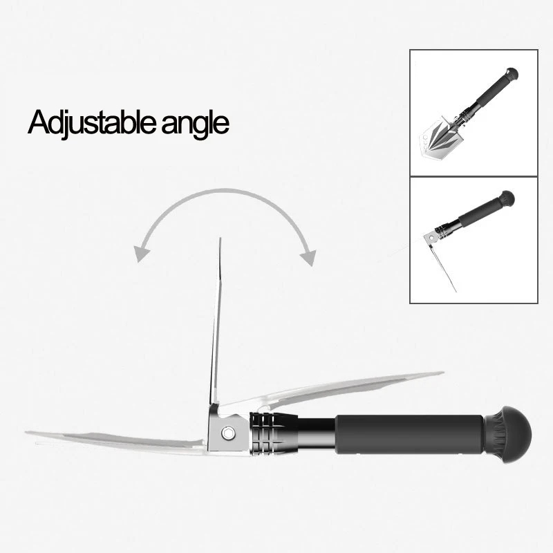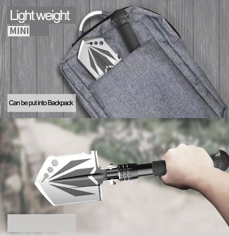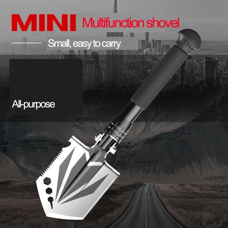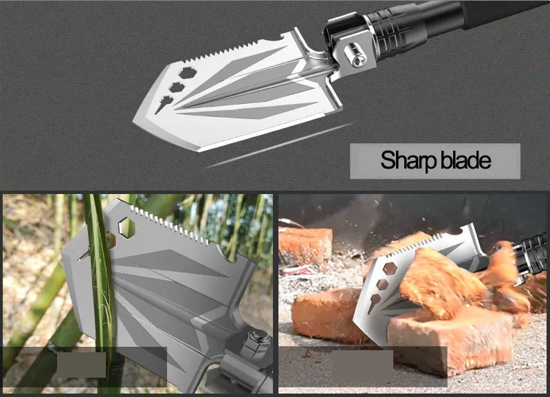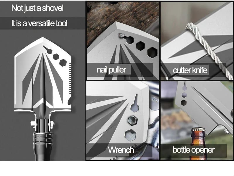 - Multifunction shovel: Small shovel; rope cutter, nail puller; hex-wrench, saw; straight cutting edge; bottle opener.