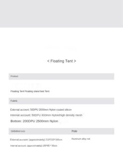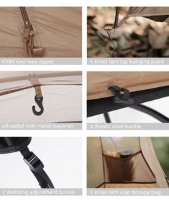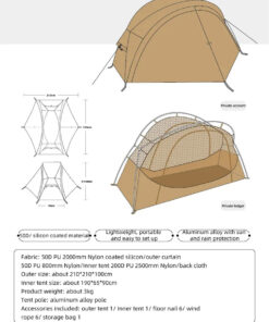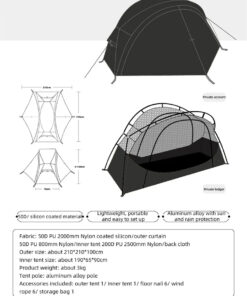 - Outer tent material: 50DPU silicone coated nylon (PU2000MM waterproof index).
