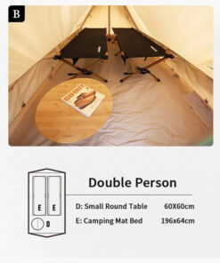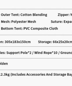 - Primary tent material: Blended polyester & cotton blend material (PU1000MM waterproof index) + polyester mosquito mesh.