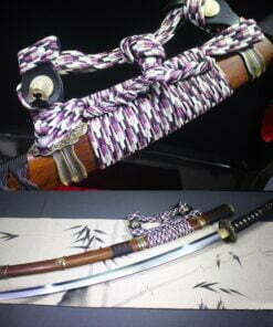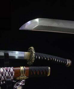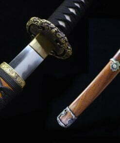 Equipped with a 1095 steel sword blade, which is a modern, highly refined, iron base-steel alloyed with a high on average 1.0% carbon content, significant manganese, and trace amounts of phosphorus and sulphur.