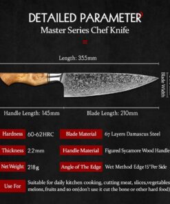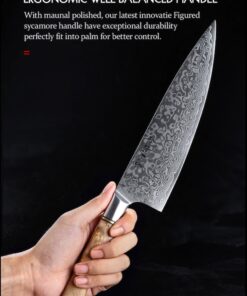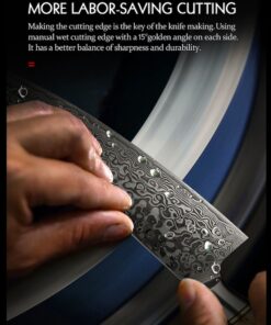 This Damascus kitchen knife is perfect for constant working use. It will hold a sharp edge for longer and will remain in optimal condition, even with constant exposure to water.