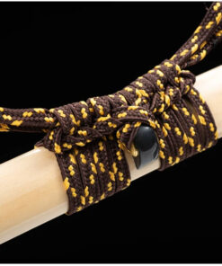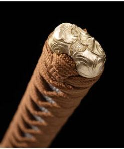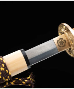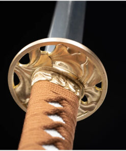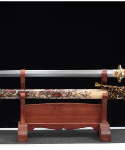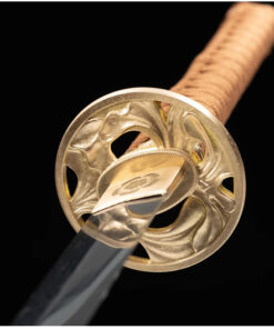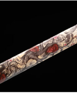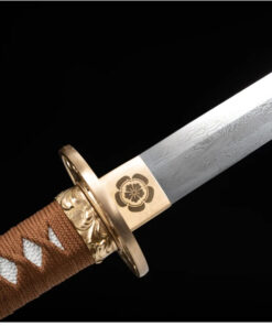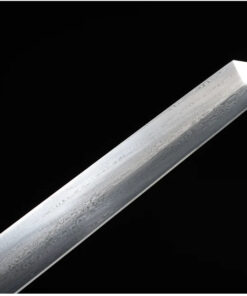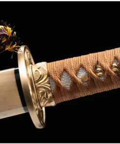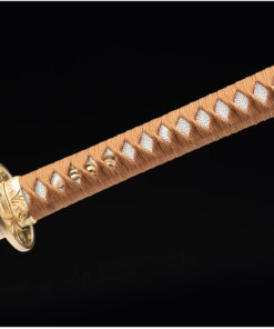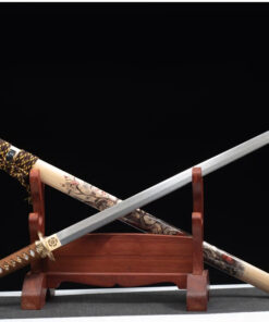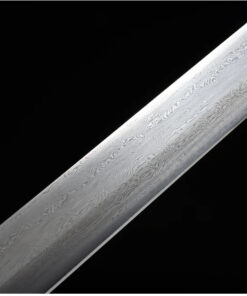 Equipped with a Damascus folded steel blade, which is a crucible mixture of 1060 high carbon steel, manganese spring steel, 1045 soft steel and many more smaller portions of other steels. This mixture is then folded multiple times to remove impurities, creating many hundreds of individual steel layers, finally producing arguably the best sword-making steel available.