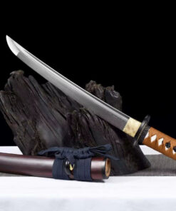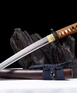 Completed with a lacquered hardwood Tanto sheath, quality knife fittings, and a hardwood, wrapped with pu-leather & quality-cord handle, forming a practical and effective hand-grip.