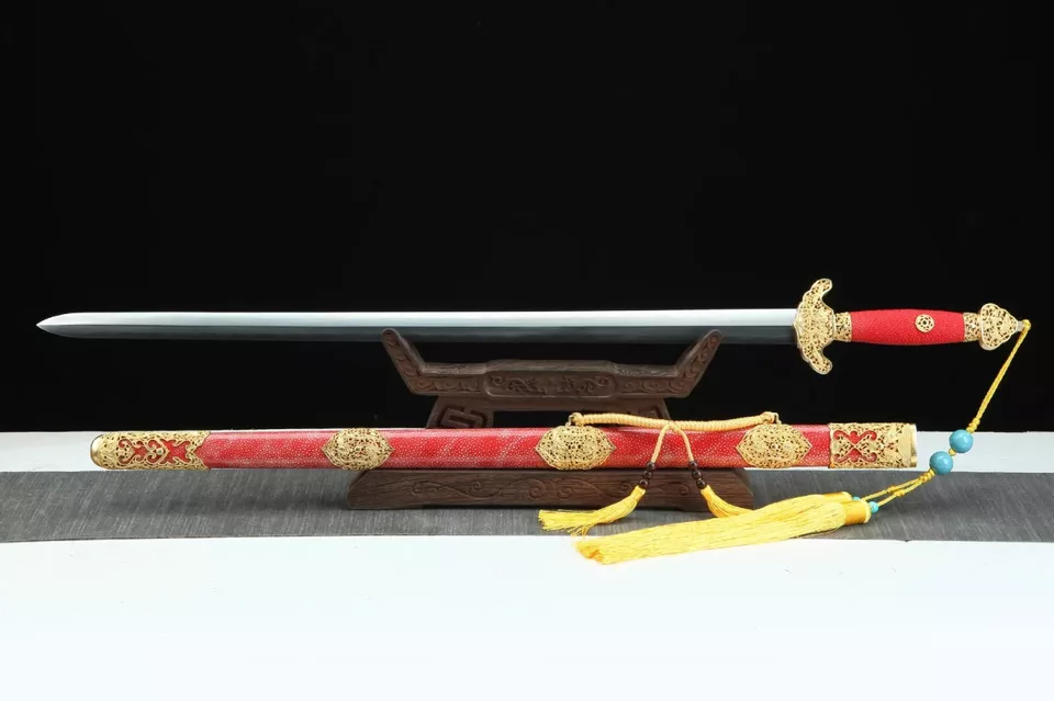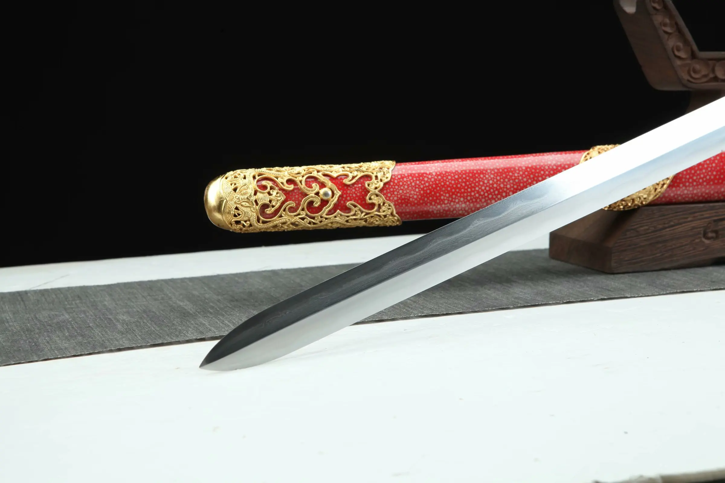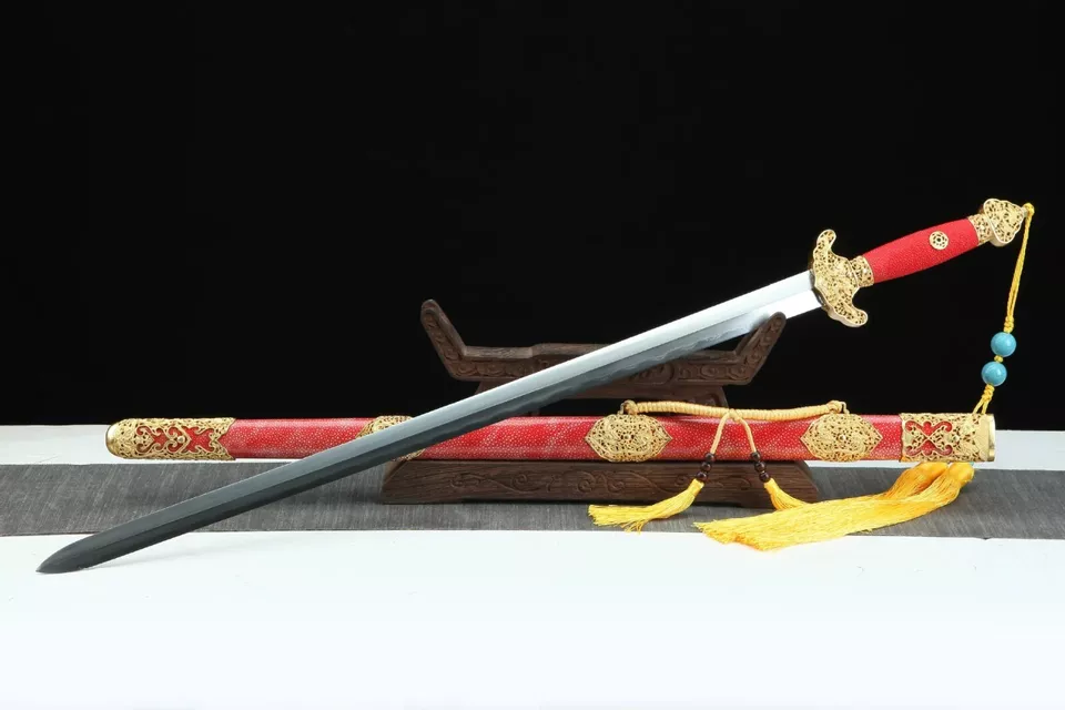 - Straight sword blade – versatile cutting and thrusting Jian weapon.