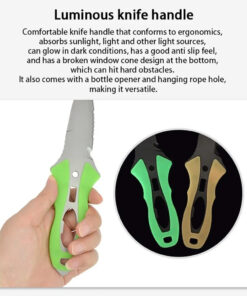 The handle material is a non-slip luminous rubber which glows in the dark and provides a firm grip-hold. The knife slots into a tough ABS plastic sheath, with quick release button for access to your knife. Additional built-in tools include a glass breaker pommel, bottle opener and rope attachment points.