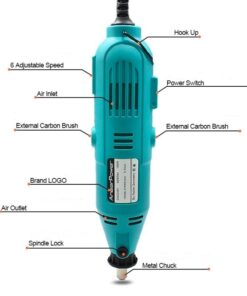 The tool has a quality pure copper motor, long life bearings and external carbon brush access for painless replacement. Plenty of ventilation keeps the high rpm tool cool, rpm speeds are adjustable (6-speed) and there’s a convenient hook hanger for the tool.