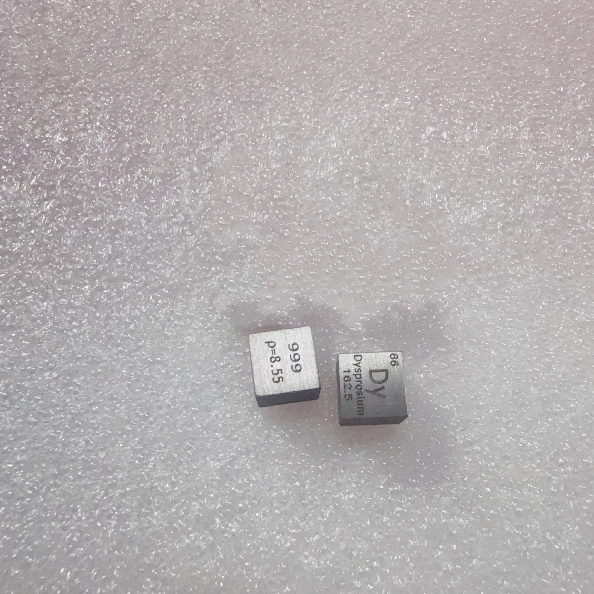 - Block engravings include – chemical symbol (Dy), atomic number (66), atomic weight (162.5), element density (p=8.55g/cm3) and purity (99.9%).