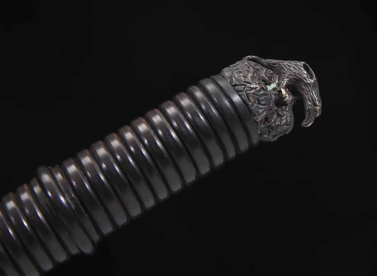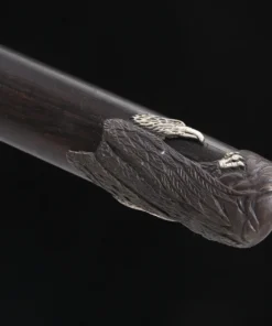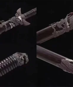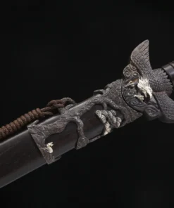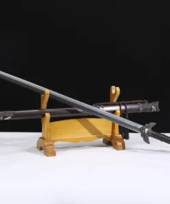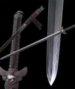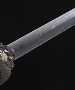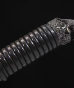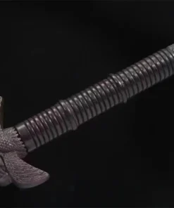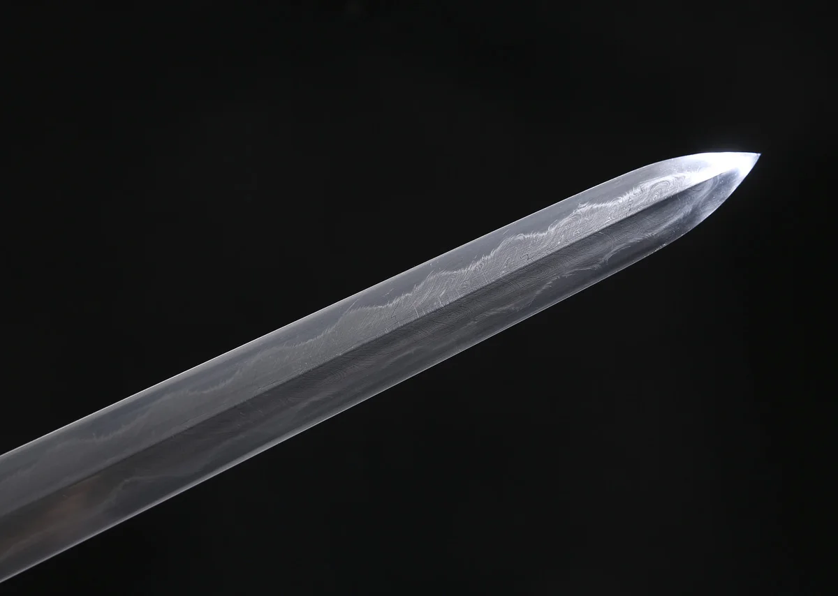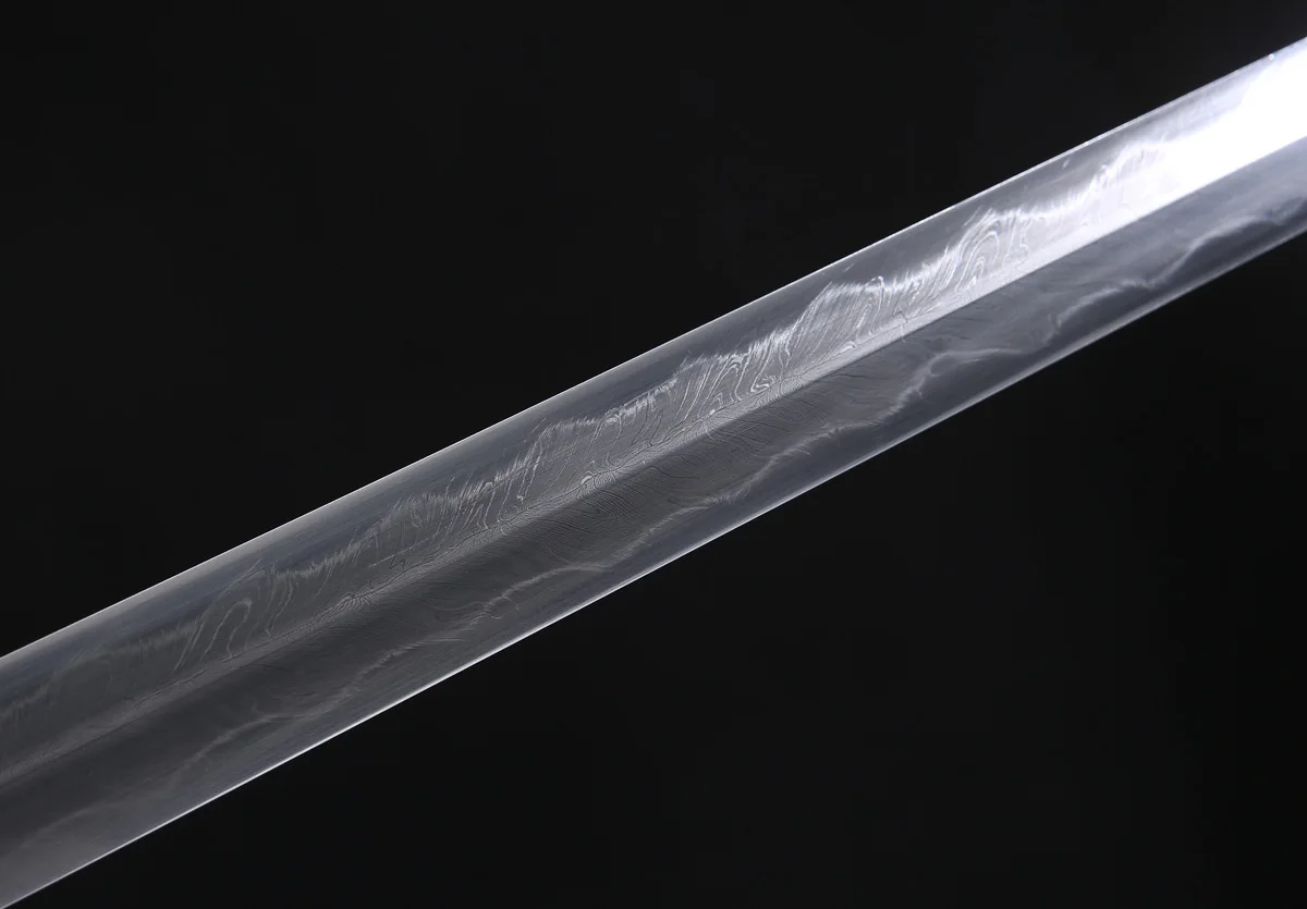 Equipped with a folded steel blade, which is a hammer-welded mixture of 1095 & 1060 high carbon steel, manganese spring steel, 1045 soft steel and many more smaller portions of other steels. This mixture is then folded multiple times to remove impurities, creating many hundreds of individual steel layers, finally producing arguably the best sword-making steel available.