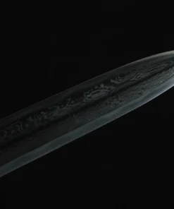 Equipped with a folded steel blade, which is a hammer-welded mixture of 1095 & 1060 high carbon steel, manganese spring steel, 1045 soft steel and many more smaller portions of other steels. This mixture is then folded multiple times to remove impurities, creating many hundreds of individual steel layers, finally producing arguably the best sword-making steel available.