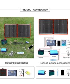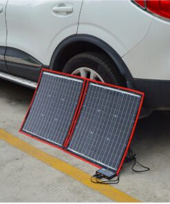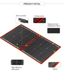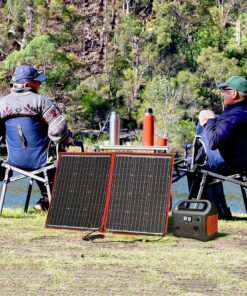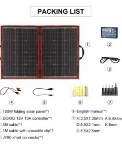 2) 100 watt camping solar panel – Unfolded size (LxW) 107x73cm; folded size (LxW) 73×53.5cm; weight 3.6kg; maximum power point current 6.1A.