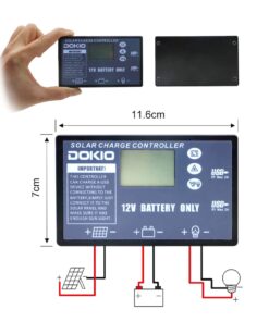 Solar controller features: Temperature; voltage; amp-hour; battery capacity; charging symbol; display area (panel & load); further note – NOT waterproof.