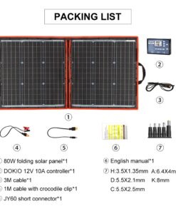 1) 80 watt camping solar panel – Unfolded size (LxW) 108x57cm; folded size (LxW) 54x57cm; weight 2.1kg; maximum power point current 4.44A.