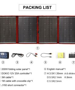 4) 200 watt camping solar panel – Unfolded size (LxW) 216x73cm; folded size (LxW) 73x54cm; weight 5.2kg; maximum power point current 11.12A.