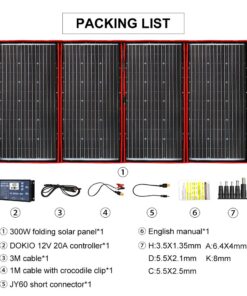 5) 300 watt camping solar panel – Unfolded size (LxW) 216x104cm; folded size (LxW) 104x54cm; weight 7.1kg; maximum power point current 16.67A.
