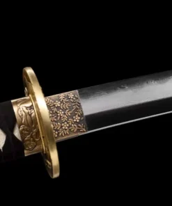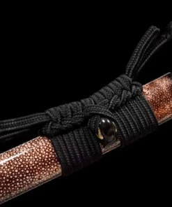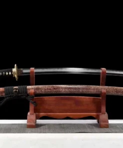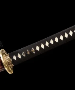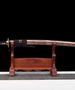 Equipped with a folded steel blade, which is a hammer-welded mixture of 1095 & 1060 high carbon steel, manganese spring steel, 1045 soft steel and many more smaller portions of other steels. This mixture is then folded multiple times to remove impurities, creating many hundreds of individual steel layers, finally producing arguably the best sword-making steel available.