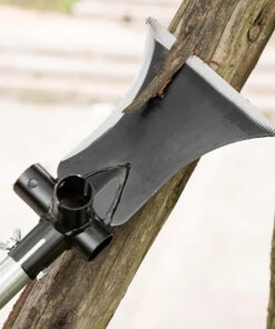 The four-way shaft housing will take any handle material, not only the optionally included steel handle, but also wood, rigid plastic, etc, as long as it fits the shaft collar housing. More importantly however, this four-way housing allows tool transformation into a garden hoe grub tool for grow-bed digging & soil cultivation, a weed cutter tool & tree-branch pruner and garden axe.