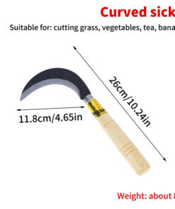- Wood handle sickle: Overall size – 26cm; blade length – 11.8cm; weight – 86g.