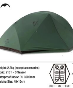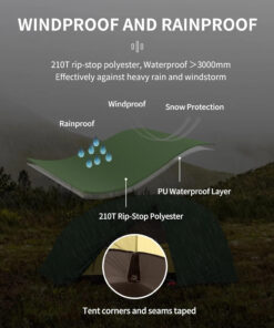 - Tent flysheet material: 210T anti-tear polyester – tape seam sealed (PU3000MM waterproof index).