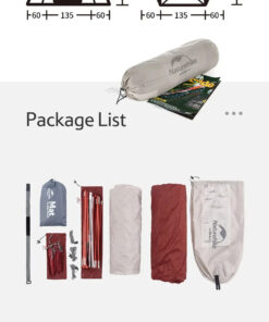 - Included: 1x inner tent; 1x fly sheet; aluminum tent stakes; folding aluminum poles; tent ropes; 1x tent carry bag.