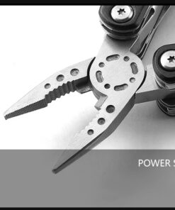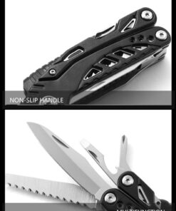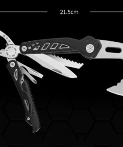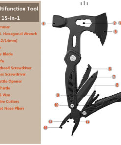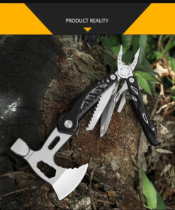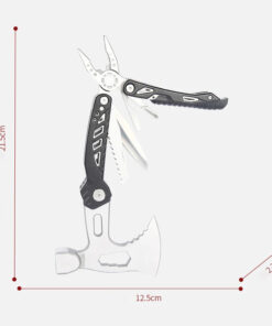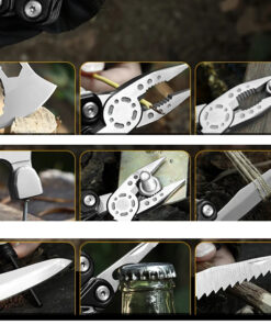 - Incorporated tools: Axe hammer & variable wrench (10/12/14mm) combo head; wood saw; survival knife; pliers; flat-head screwdriver & bottle-opener combo; Phillips-head screwdriver; emergency whistle.