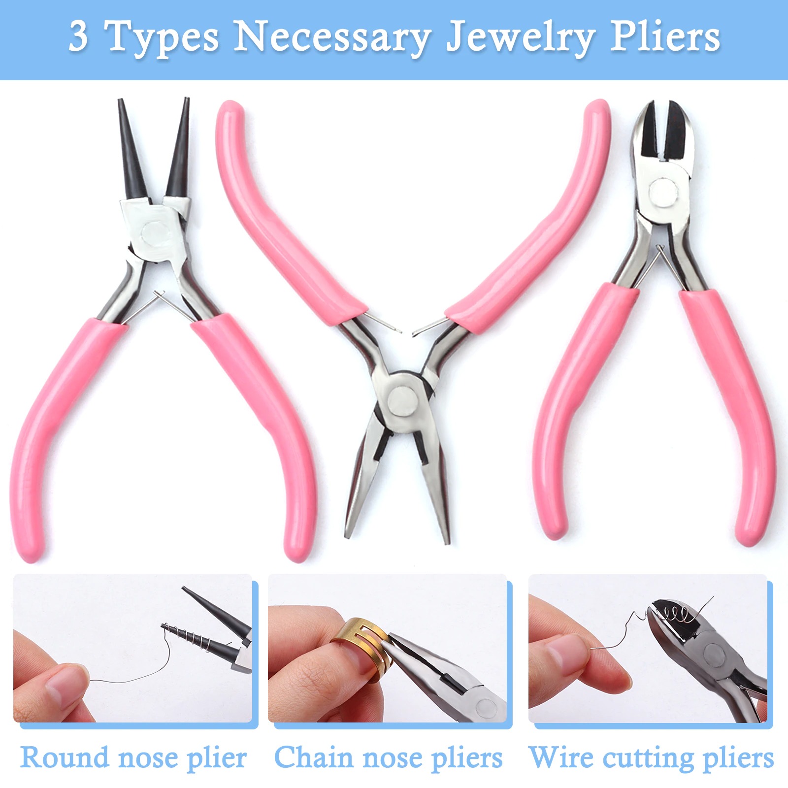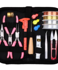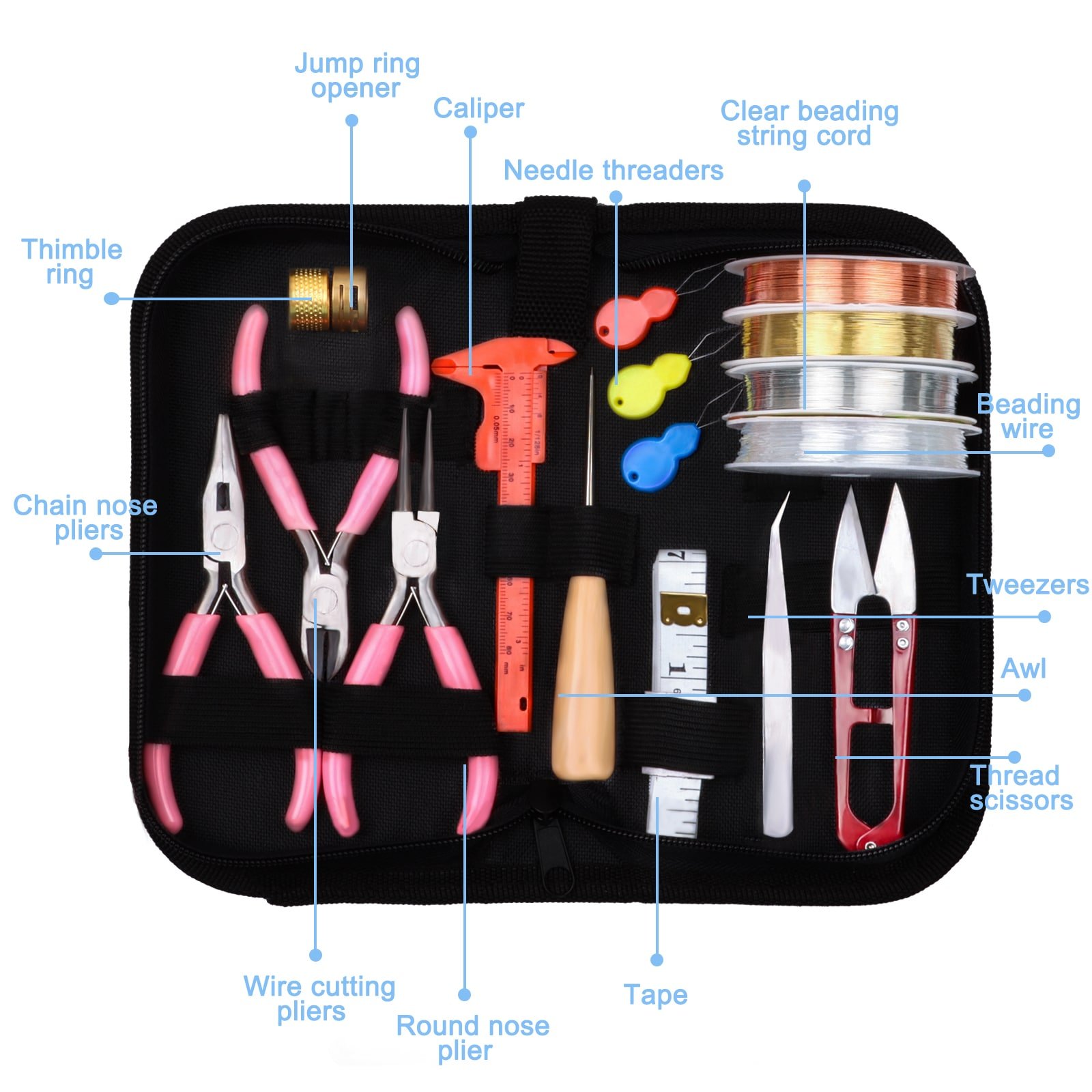 Incorporated tools (jewelry making kit): Needle threader x3; mini vernier caliper; jump rings opener; copper wire x4; thimble ring; U-scissors; tweezers; sewing tape; wooden awl; pliers x3.