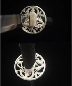 Themed with the silver water dragon, prominently showcasing a picture narrative of two dragons playing together within the Tsuba hand-guard, along with many other dragon illustrated sword-fittings. These symbols can be loosely translated as “dragons playing with pearls in the sea”.
