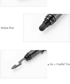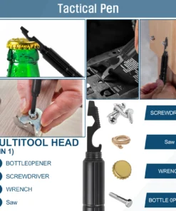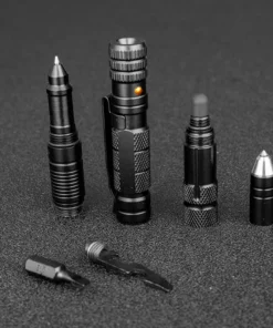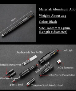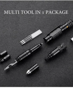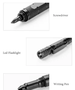 - Incorporated tools: Flashlight; window breaker; bottle opener; writing pen; hex-wrench; Phillips + flat-head screwdriver; serrated knife blade.