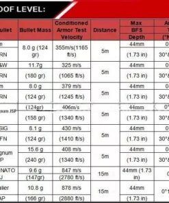 - Rated bulletproof vest level 4 – NIJ IV, tested to stop .30-06 M2 AP and 7.62×63 API rounds @ 15 meters.