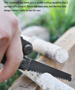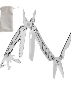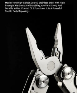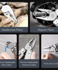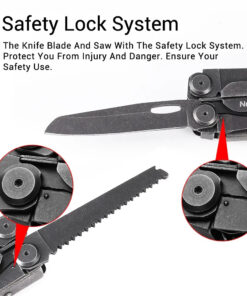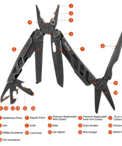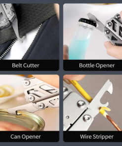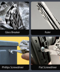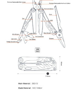 Incorporated tools: 5 function pliers + replaceable hard wire cutter bits; measurement ruler; scissors; glass breaker; wood saw; flat-head screwdriver; Phillips screwdriver; emergency line cutter; wire stripper; bottle opener; can opener; knife blade.