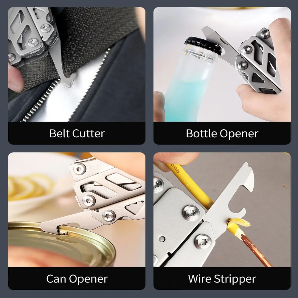 Incorporated tools: 5 function pliers + replaceable hard wire cutter bits; measurement ruler; scissors; glass breaker; wood saw; flat-head screwdriver; Phillips screwdriver; emergency line cutter; wire stripper; bottle opener; can opener; knife blade.