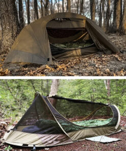 What sets this solo tent apart from other coffin style army bivvy tents is the dual layer tent design, as well as the hall entry, which doubles for wet gear storage and a safe, sheltered outdoor cooking area. Additionally, the pop-up, instant inner tent is very quick to deploy, leaving only the pegs and outer rain fly to be assembled. Probably about 30% quicker to erect than a normal hiking tent.