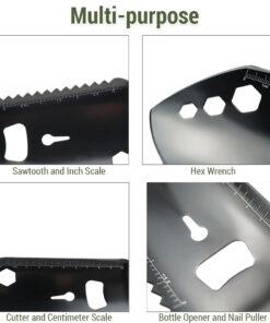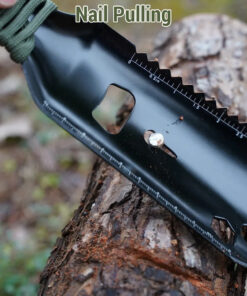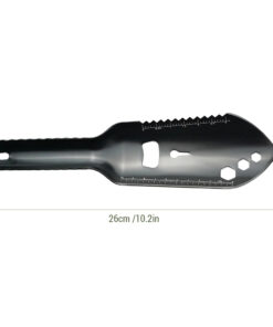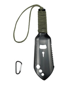 - Multi tool shovel – small shovel; saw; measurement ruler; 3x hex-wrench; nail puller; bottle opener; paracord rope (2.5m).