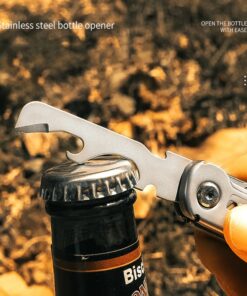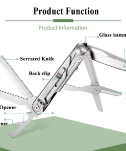 - Incorporated tools: Primary knife; glass breaker; scissors; wood saw; serrated knife; belt clip; can & bottle opener + wire stripper combo.