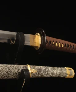 The stingray-skin wrapped hardwood scabbard, along with the solid brass sword-fittings, complement the classic brown Katana handle with authentic taste. And the hardwood, wrapped with real stingray-skin & quality cord handle form a traditional, practical and effective Japanese Samurai hand-grip.