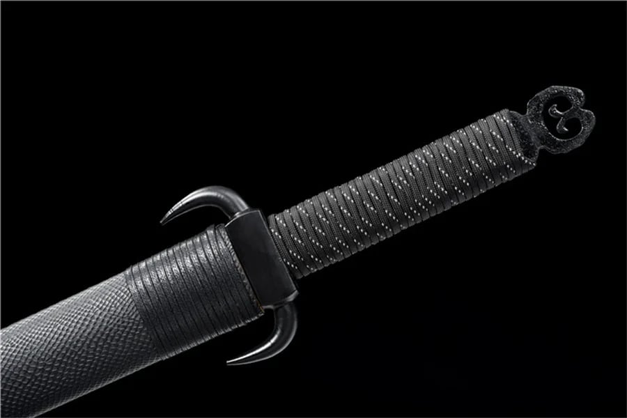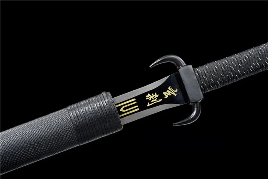 A cord bound handle provides an excellent gripping surface, the hardwood + synthetic leather scabbard is sleek and stealthy, and lastly the steel hand-guard acts as an effective sai-style sword breaker.