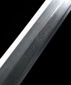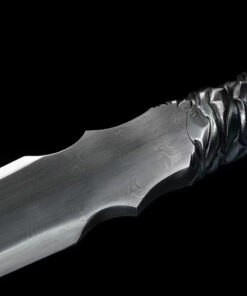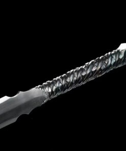 Equipped with a Damascus steel blade, which is a crucible mixture of 1060 high carbon steel, manganese spring steel, 1045 soft steel and many more smaller portions of other steels. This mixture is then folded multiple times to remove impurities, creating many hundreds of individual steel layers, finally producing arguably the best sword-making steel available.