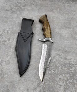 Constructed with Damascus steel, the blade sharpens to an unmatched razor sharp degree and is naturally resilient against edge chipping and blade fracture. An exotic sandalwood handle along with a high quality stainles steel hand-guard is secured to the blade’s tang, and the knife is housed within a genuine leather sheath, which is both hand carved and stitched.