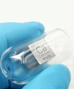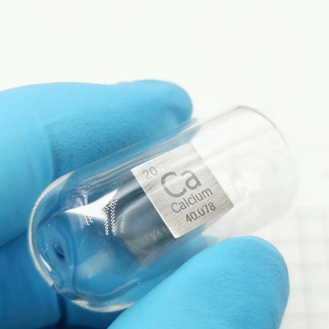 This small calcium metal sample is sealed in an air-tight glass ampoule, which is filled with an inert argon atmosphere to prevent sample degradation.