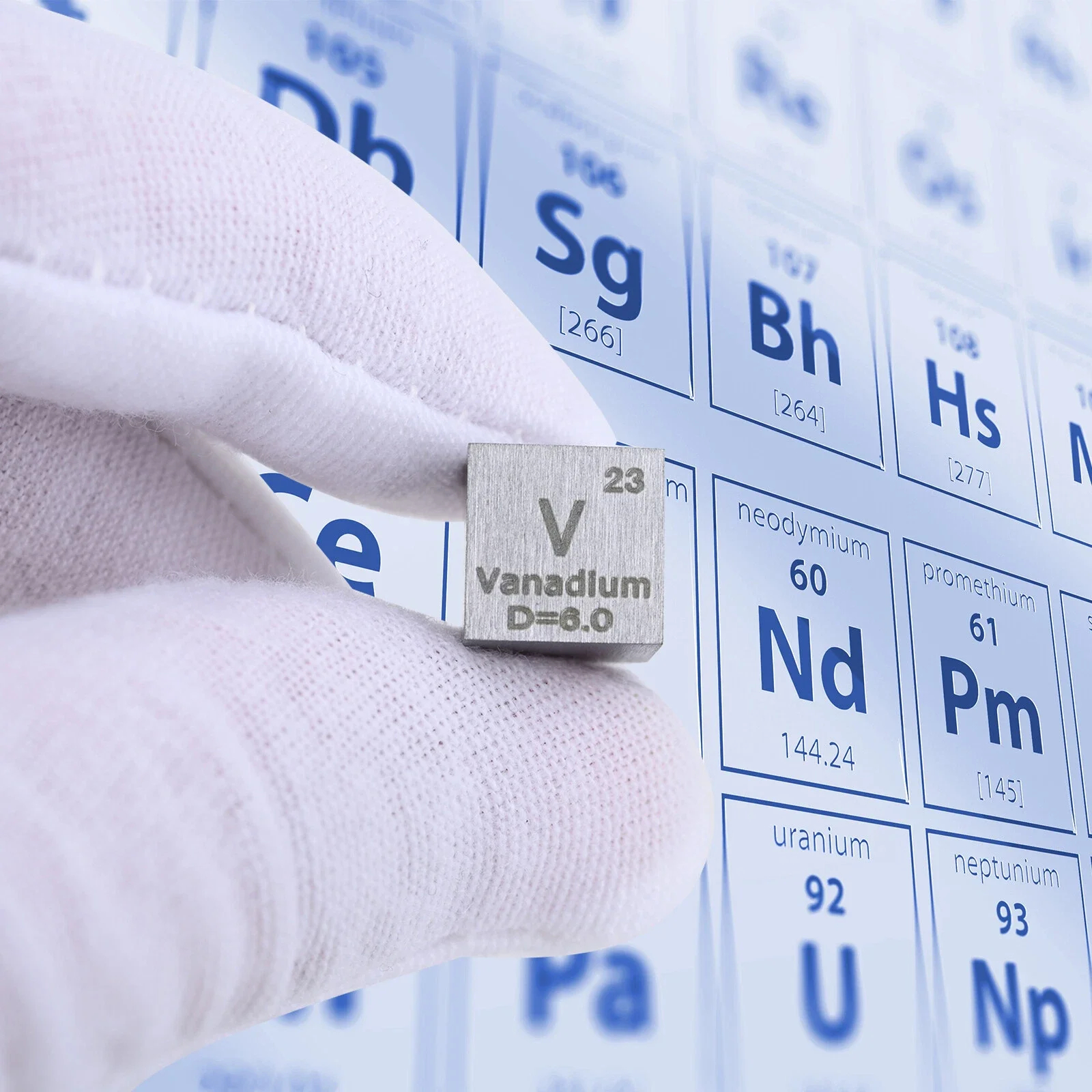 - Block engravings include – chemical symbol (V), atomic number (23), atomic weight (50.9415), element density (D=6g/cm3) and purity (99.9%).