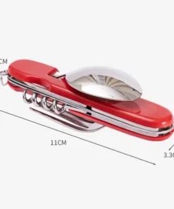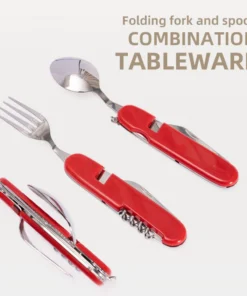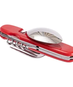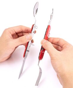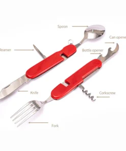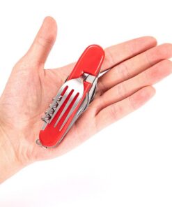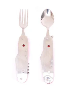 Incorporated tools: Can opener + bottle opener combo; spoon; fork; knife; cork screw.